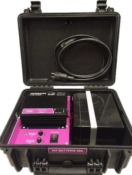 Le kit batterie pèse 11.5kg tout compris et se présente en caisse plastique robuste de 40x20x34cm, IP65. Grace à sa poignée de transport il est facile de l’emmener partout. Il est également équipé d’une LED de visualisation de l’état de décharge de la batterie.